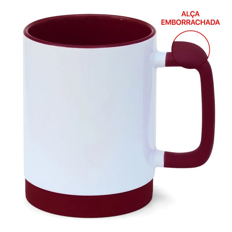 Caneca para Sublimação de Cerâmica Branca com Alça Soft e Base em Silicone com Interior Vinho. Feita de cerâmica branca de alta qualidade, esta caneca é ideal para personalização por sublimação, permitindo adicionar fotos, logotipos, desenhos ou mensagens com precisão.