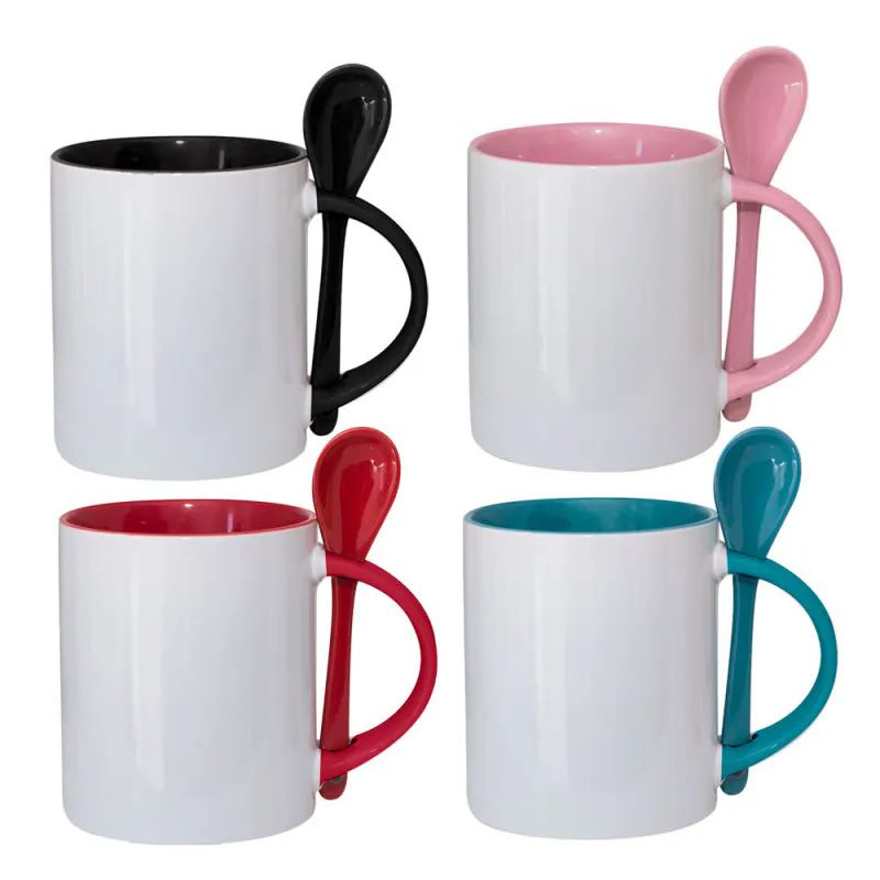 A clássica caneca reta para sublimação agora vem com colher de cerâmica no encaixe da alça – um charme a mais para suas criações! 💥