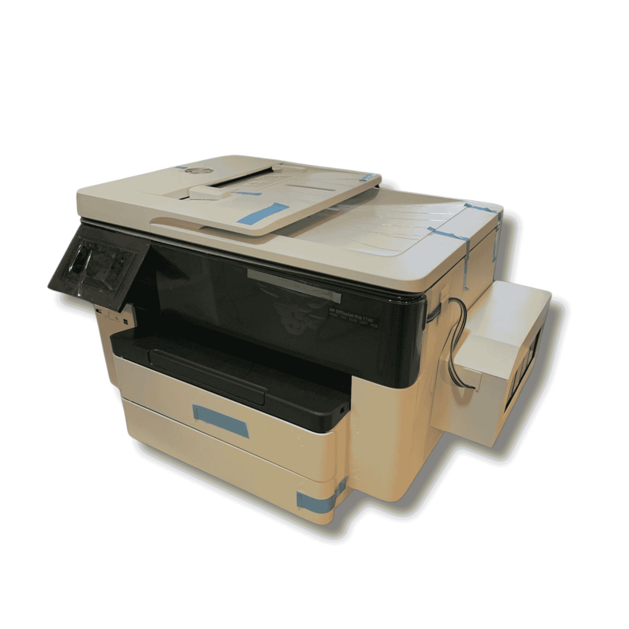 Impressora HP OfficeJet 7740 com sistema contínuo de tinta Bulkink (250ml por cor) e chipless direto na placa! Ideal para quem precisa de produtividade e economia: imprime até A3, tem Wi-Fi, frente e verso automático, scanner, copiadora e qualidade profissional. Pronta para grandes volumes, sem dor de cabeça com troca de cartuchos. É ligar e lucrar!